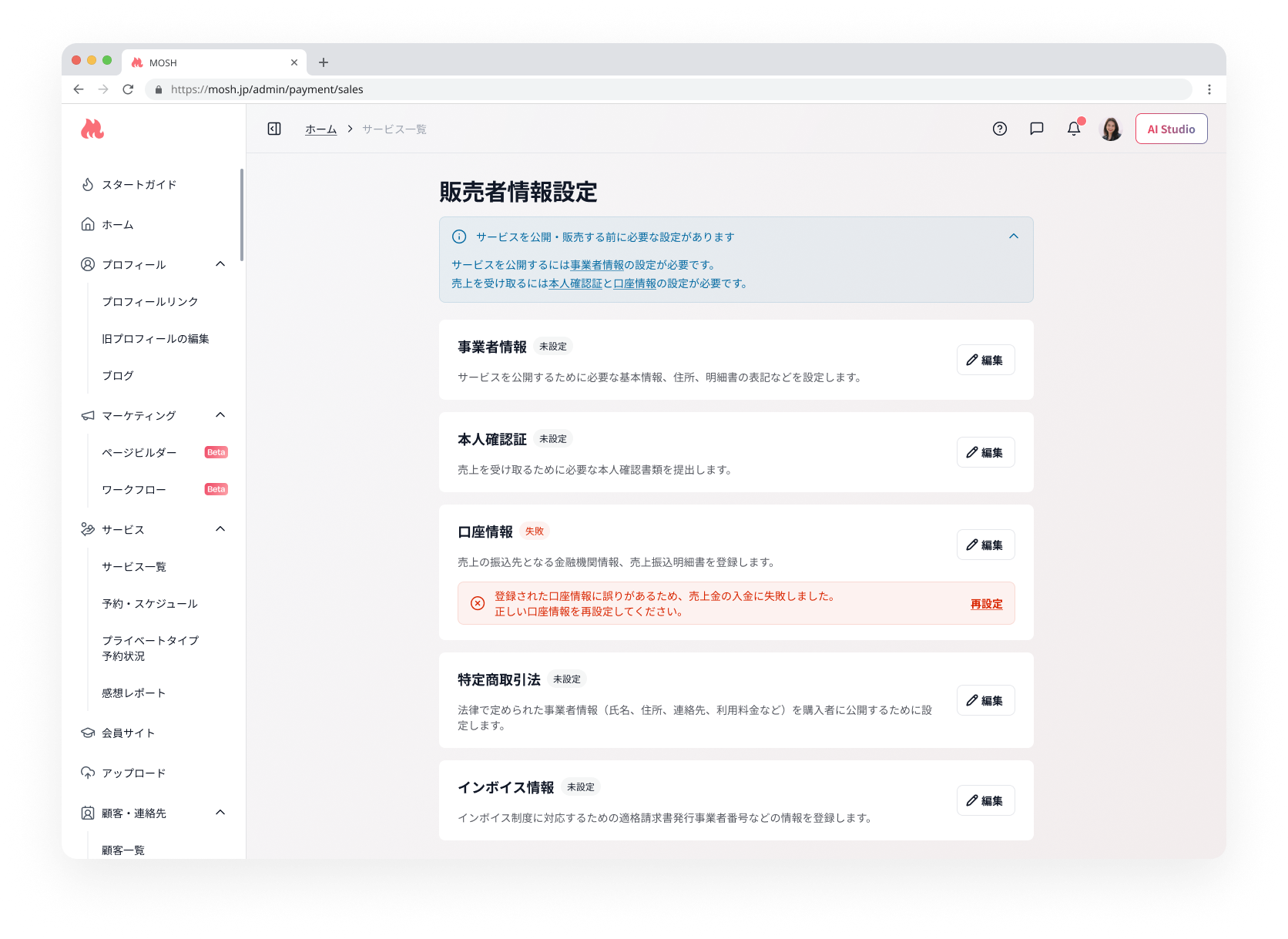 MOSHでサービスを公開・運営する上で必須となる販売者情報設定や決済情報設定。