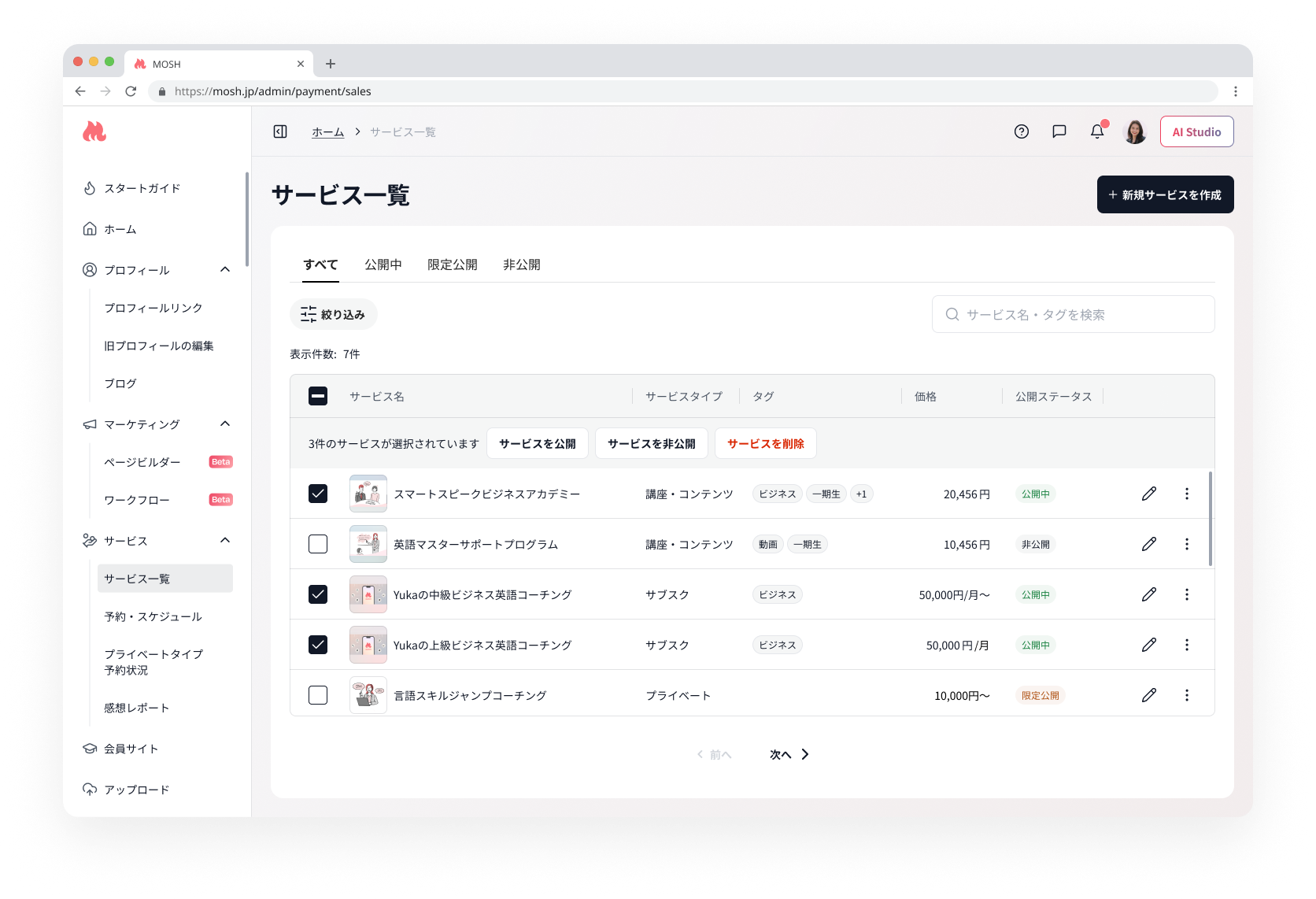 MOSH AI Studioは、MOSH 2.0を形づくるコアな体験となります。 それは単なる設定や代行作成ではありません。 思いを持った個人が、自分のサービスと活動プランを創り上げ、事業として拡張させていくための”スタジオ”です。