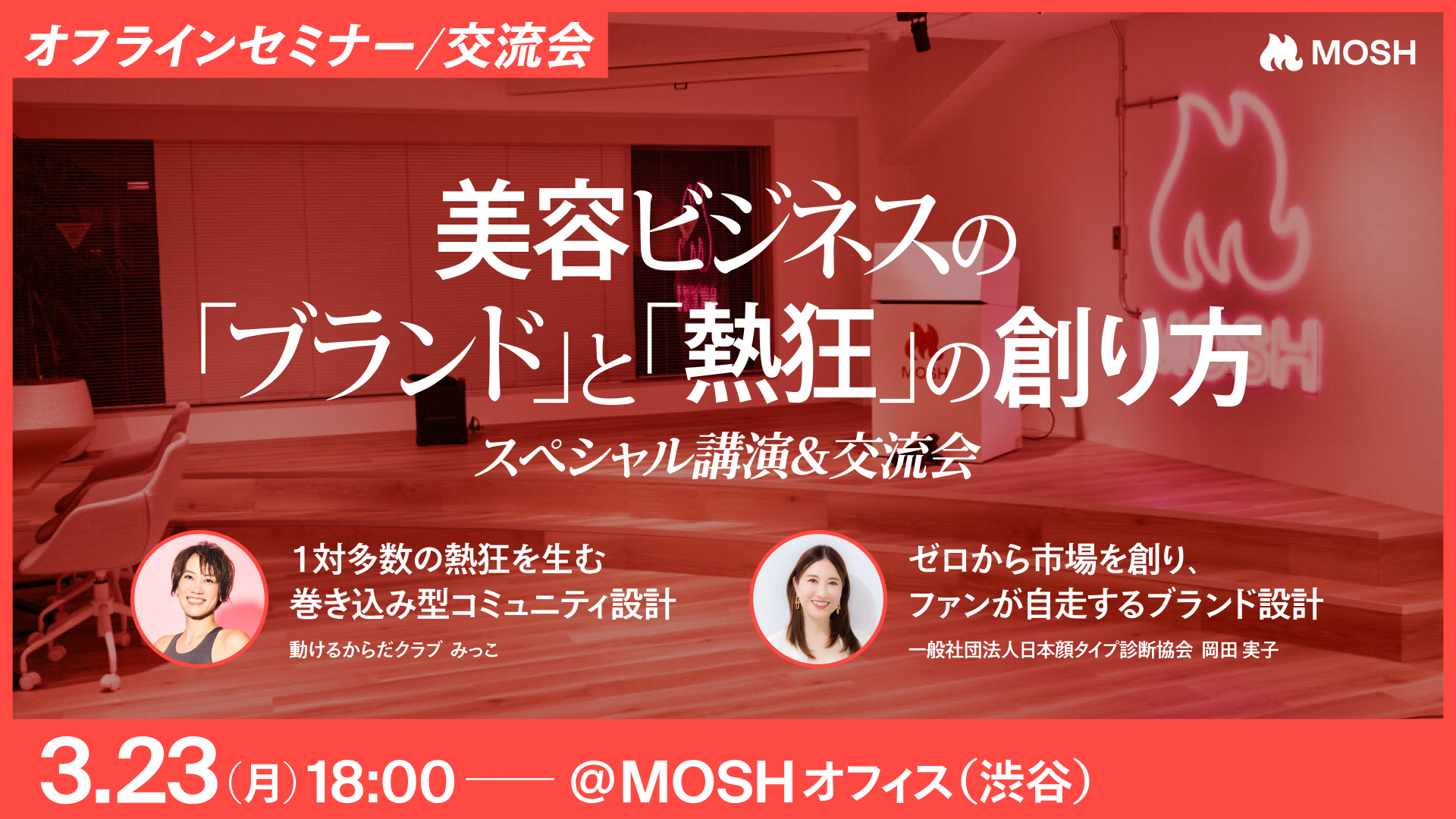 本交流会は美容系事業者向けの学びの場として、みっこ氏(YouTube登録者82万人超)は1対1から1対多数へ広げるコミュニティ設計を、岡田実子氏(顔タイプ診断®︎創業者)はゼロから市場を創り、ファンが自走するブランド設計を語ります。