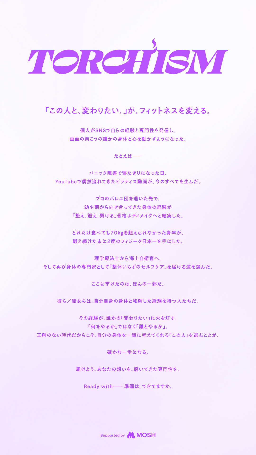 MOSH株式会社(本社:東京都渋谷区、代表取締役社長:籔 和弥、以下「MOSH」)は、個人クリエイターと共創するプロジェクト「TORCHISM(トーチズム)」の第4弾として、フィットネスカテゴリーを公開いたしました。