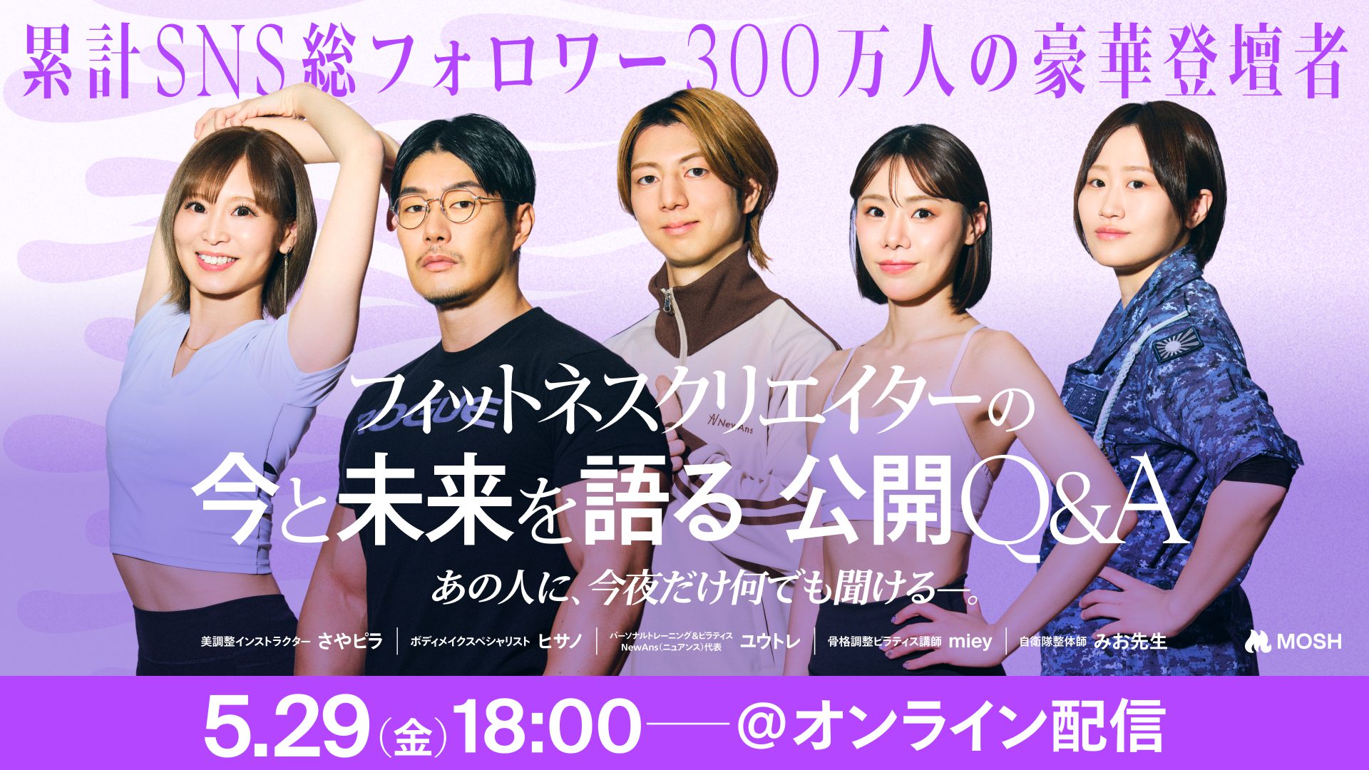 さやピラ・ヒサノ・ユウトレ・miey・みお——累計SNS総フォロワー300万人を超える5名が登壇。「フィットネスで人生が変わった瞬間」をテーマにしたトークと、事前質問+ライブQ&Aで、実際に選ばれているクリエイターのリアルに迫ります。