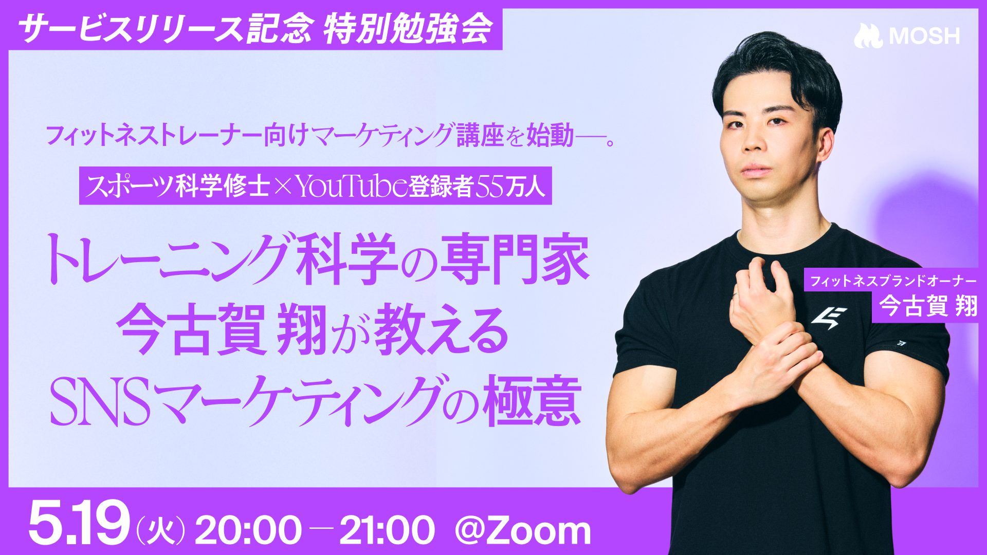 スポーツ科学修士(早稲田大学大学院スポーツ科学研究科卒)、YouTubeチャンネル登録者55万人・SNS総フォロワー100万人超のフィットネスブランドオーナー・今古賀翔氏が、ついにフィットネストレーナー向けマーケティング講座をMOSHにて始動。10年以上のWeb集客経験を体系化した同講座のリリースを記念し、特別勉強会を開催します。