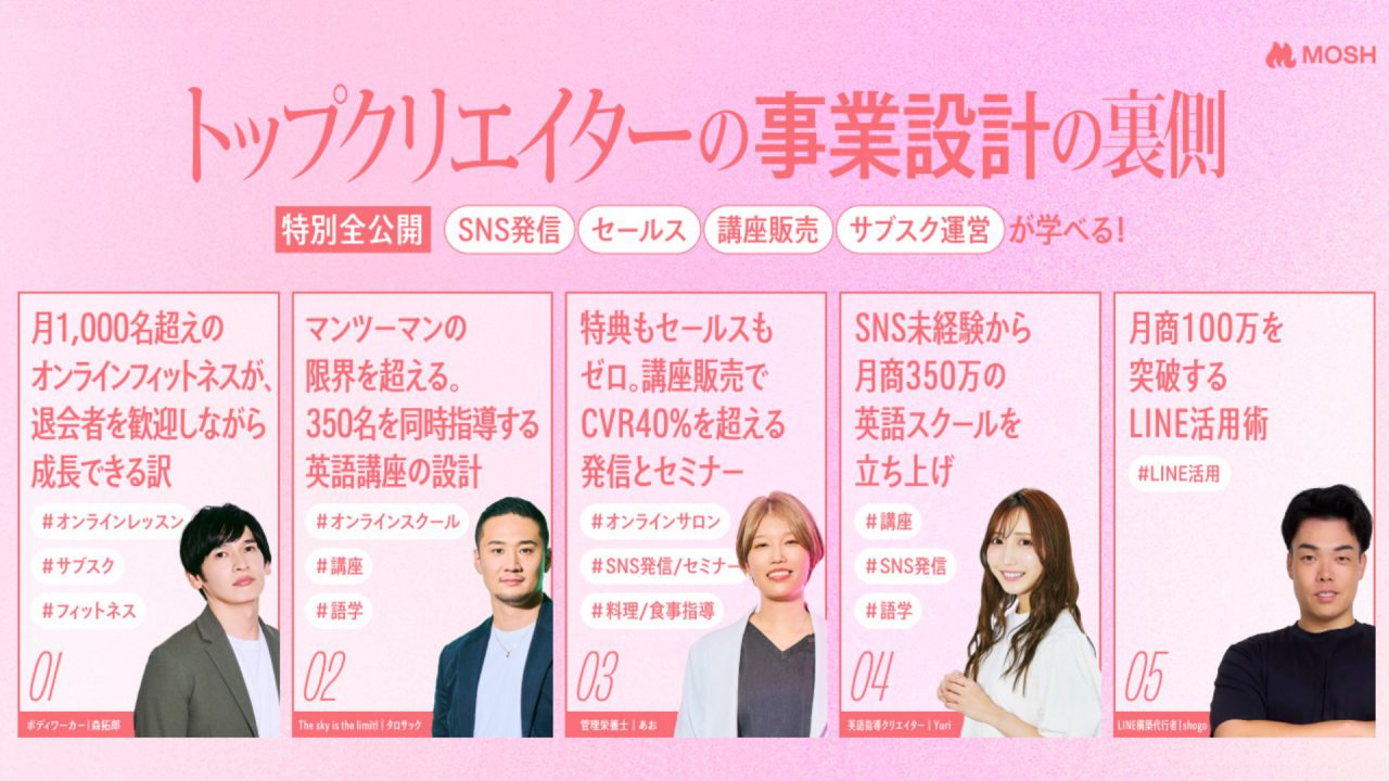 本セミナーでは、250以上のLINEアカウントを支援してきた中川聖悟氏と、8万人のクリエイター(事業者)が登録するMOSHが、LINEとMOSHを活用しスケールするクリエイターの共通点を語ります。